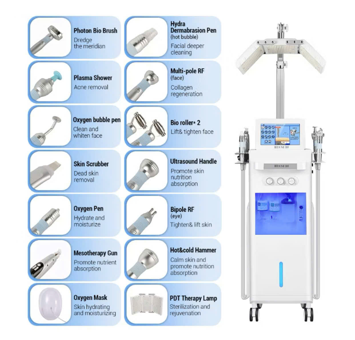 Máy chăm sóc da 14 in 1 là thiết bị làm đẹp đa năng tích hợp công nghệ spa hiện đại, giúp bạn chăm sóc da chuyên sâu ngay tại nhà hoặc nâng cấp dịch vụ spa chuyên nghiệp. Với thiết kế thông minh và đầy đủ chức năng, đây là lựa chọn lý tưởng cho những ai muốn sở hữu làn da khỏe đẹp, trẻ trung.